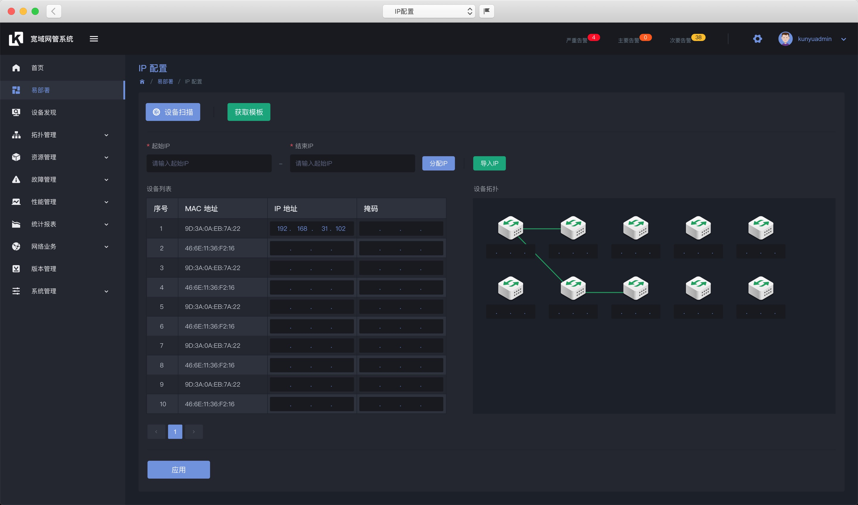 基于私有協議的設備發現和拓撲發現; 基于拓撲的可視化IP分配,可自動分配、手工調整、文件導入等多種方式進行IP配置。 |