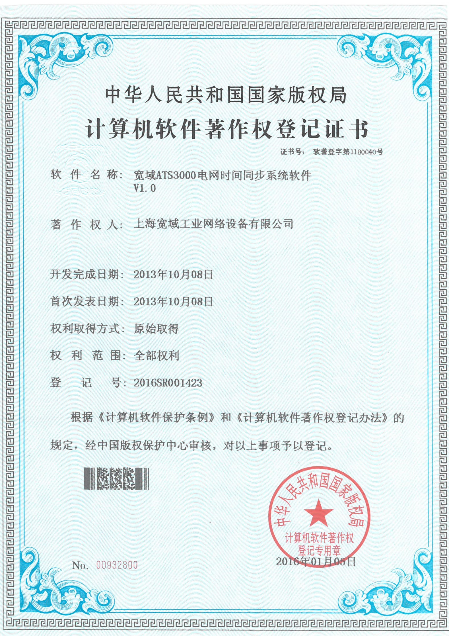 寬域ATS3000電網時間同步系統軟件V1.0軟著證書