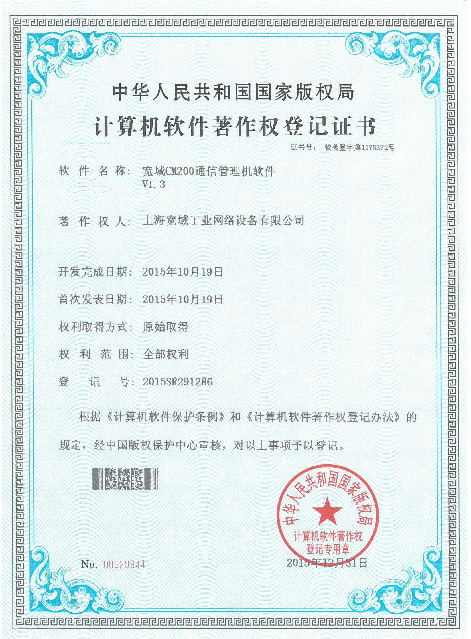 寬域CM200通信管理機軟件V1.3軟著證書