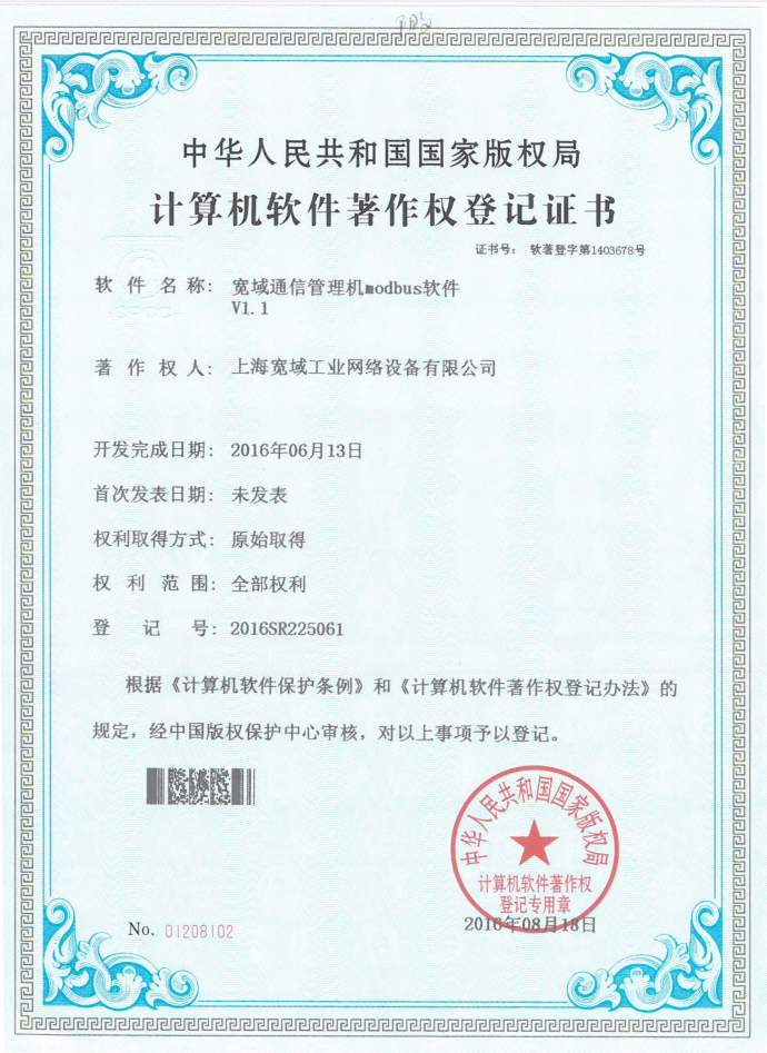 寬域通信管理機modbus軟件V1.1軟著證書