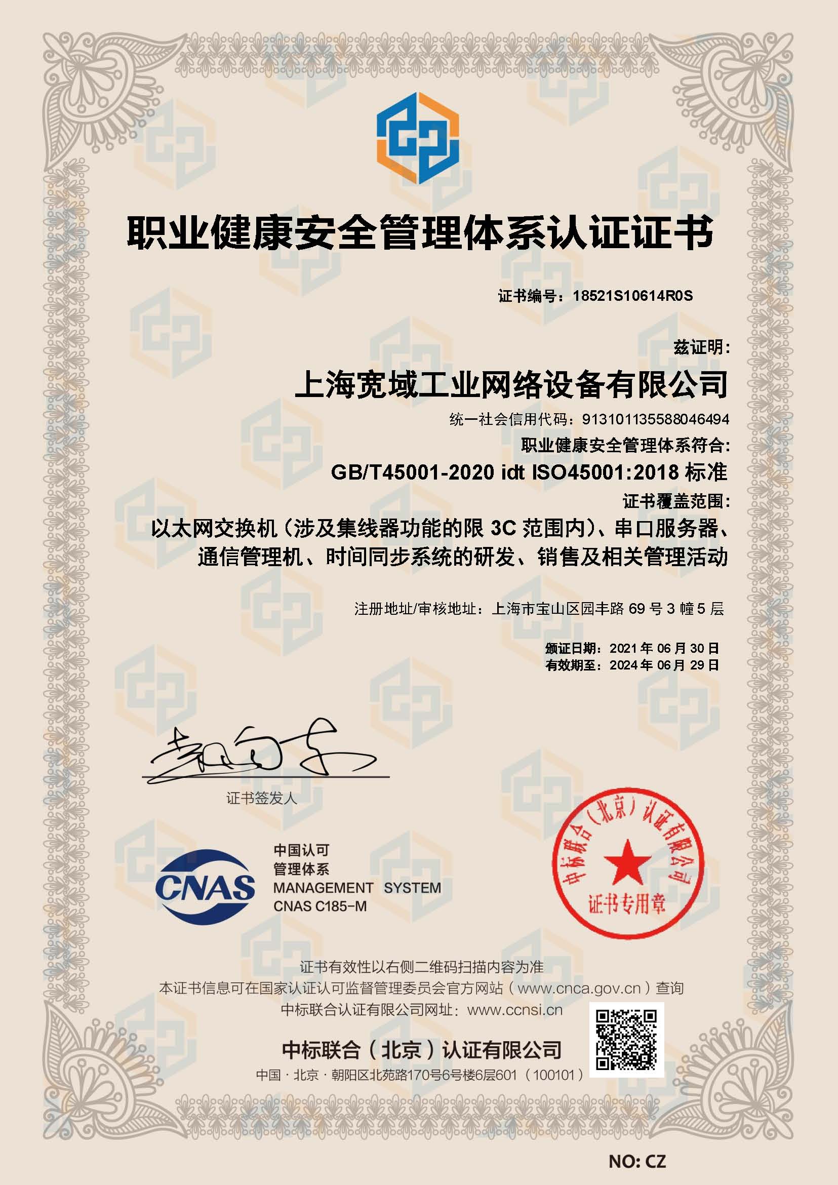 職業健康安全管理體系認證證書