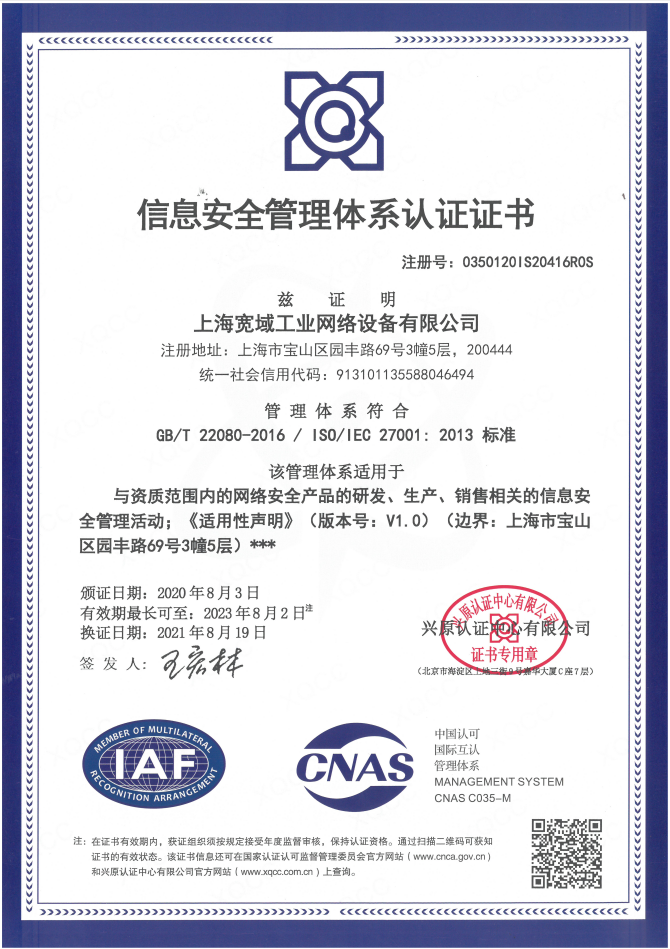 信息安全管理體系認證證書